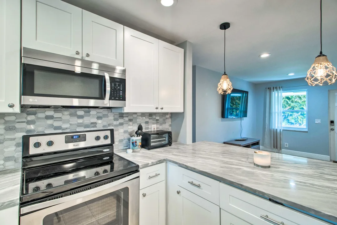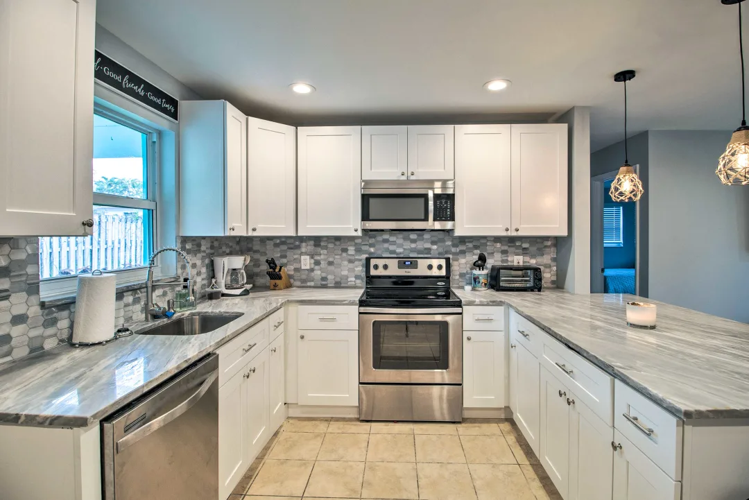 KITCHEN: Fully equipped, drip coffee maker, toaster oven, cooking basics, breakfast bar w/ seating