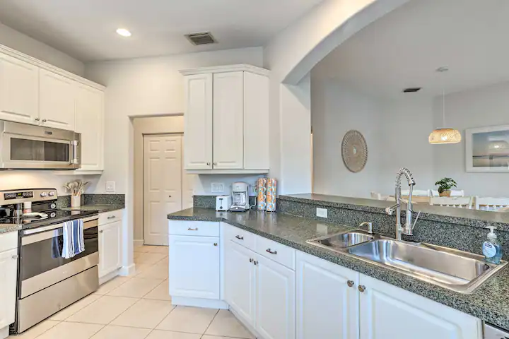KITCHEN: Stove/oven, refrigerator, microwave, dishwasher, cooking basics, ice maker, coffee maker, toaster, dishware/flatware, spices, trash bags/paper towels